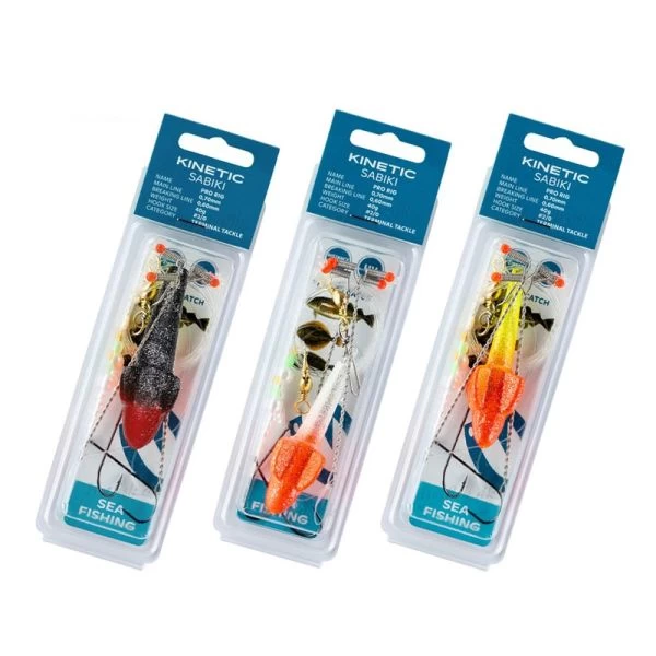 Kinetic Sabiki Pro Rig – gennemført rig med kvalitets bom og kroge. Perfekt til alt lige fra skrubbe til pighvar. Riggen er monteret op med et lod der virkelig holder bunden, selv i stærk strøm!
