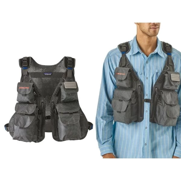 Denne fiskevest fra Patagonia giver dig mulighed for at bruge vesten sammen med Patagonia’s rygsække. Vesten består af 2 dele, forsiden, hvorpå alle lommerne sidder, og bagsiden som sidder på ryggen. Fronten kan tages af bagsiden, og påsættes Patagonia rygsække, med de monteret klips. Vesten indeholder 15 forskellige lommer, så du kan for organiseret dit grej, og så har du det hele lige inden for en håndsrækning. Vesten er produceret i 100% polyester net, med nylon lommer med DWR(vandafvisende) coating. Vesten sidder komfortabelt både alene og når du påsætter den en Patagonia rygsæk. På vesten er der flere forskellige Hypalon værktøjs holdere og D-ringe til montering af andet værktøj. Stropperne kan justeres efter enhver krops form.