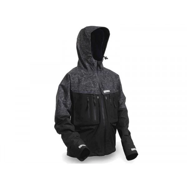 Rapala Tactics vadejakke. Vand- og vindtæt samt åndbar, 3-lags jakke med vandtætte lynlåse, vedhængskroge til grej og tilbehør, flere lommer med magnetlukning eller vandtæt lynlås, samt mønster med digital camo-detaljer.