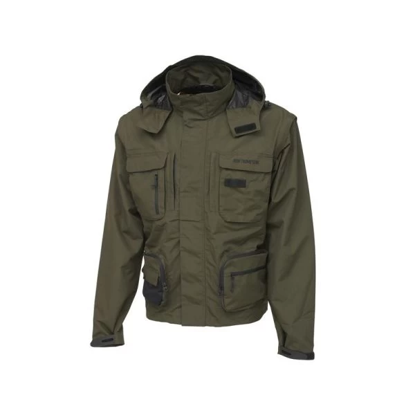 Ron Thompson Manitoba/DAM Iconic Jacket- Alsidig fiskejakke til en rigtig skarp pris! På de varme dage, eller lune aftener, kan du med et snuptag lyne ærmerne af, og konvertere jakken til en vest. Manitoba er vandtæt, vindtæt og åndbar (100% polyester oxford) Og naturligvis er jakken/vesten udstyret med et væld af detaljer som: Justerbare manchetter (velcro) – Justerbare hætte, der kan gemmes væk i kraven. Lynlås og velcrolukning front. Inderlomme med velcrolukning. 2 bryst “Napoleon” lommer med lynlås. ” frontlommer med elastik justering, samt ekstra lille lynlåslomme. 2 rummelige lommer med hhv. ekstra lynlåslomme, og ekstra lomme med 2 små lommer med velcrolukke. Justerbar i livet. “D” ring til f.eks. fangstnet. Stor rummelig (lynlås) ryglomme med drænhuller